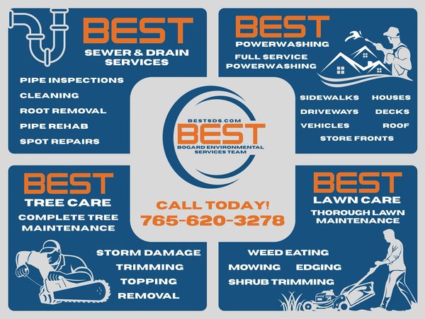 At Bogard Environmental Services Team (BEST), we specialize in providing high-quality outdoor services with a focus on safety, reliability, and environmental care. Our team brings years of experience in sewer & drain maintenance, tree work, power-washing, and lawn care, serving both residential and commercial clients. Whether it's clearing right-of-ways, handling complex tree removals, restoring surfaces with professional-grade power-washing, or maintaining pristine landscapes, BEST is committed to delivering efficient, detail-driven solutions that meet the highest standards. We take pride in helping our clients keep their properties safe, clean, and well-maintained all year long.
